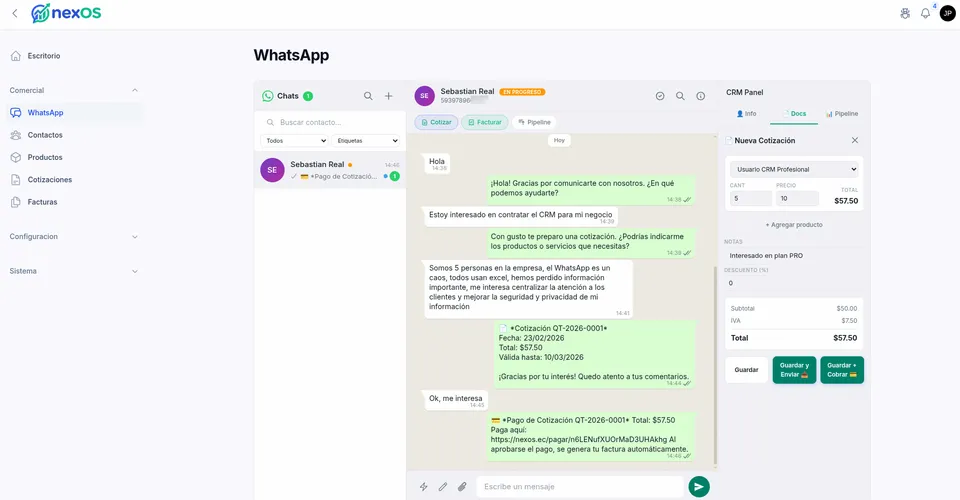 nexOS conecta WhatsApp compartido, catálogo, checkout, pagos, envíos e integraciones para que tu equipo venda con orden y active solo los módulos que realmente necesita.